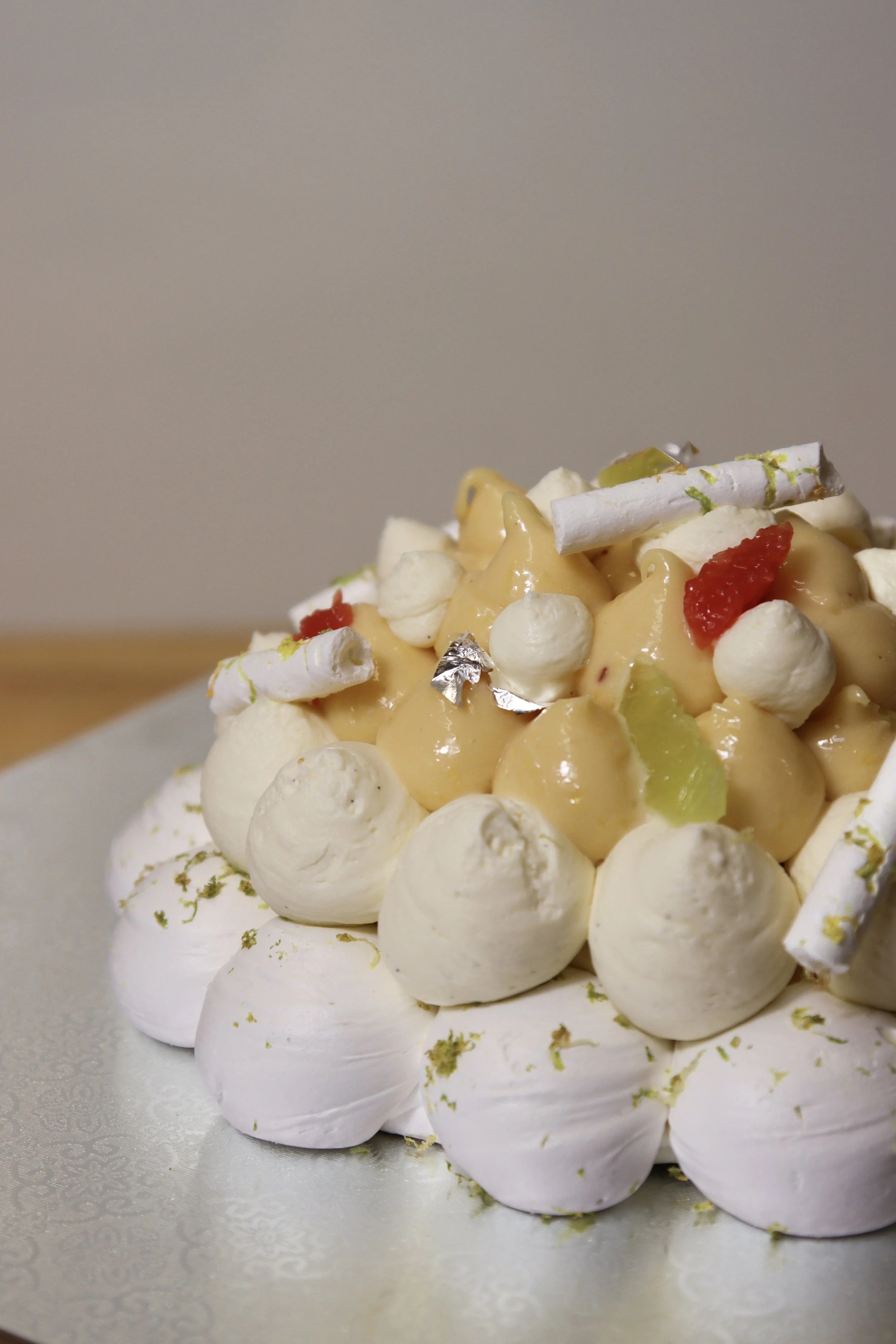 A light, crisp pavlova topped with a buttery sablé biscuit, filled with citrus gelée and lemon curd & finished with fresh lime, lemon and grapefruit.
